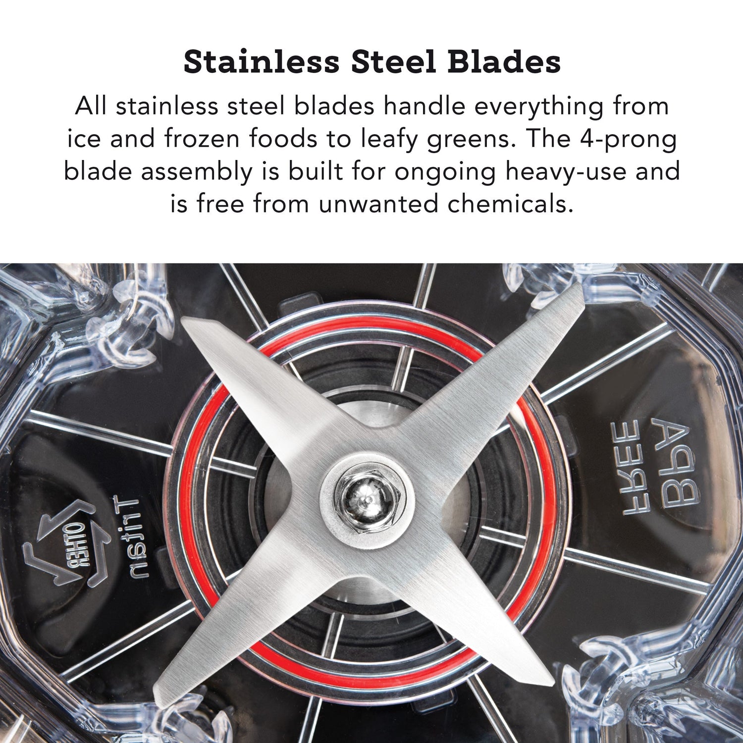 All stainless steel blades handle everything from ice and frozen foods to leafy greens. The 4-prong blade assembly is built for ongoing heavy-use and is free from unwanted chemicals.